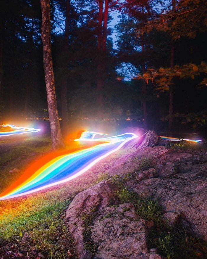 Daniel membuat foto ini dengan teknik khusus menggunakan kameranya. Foto kebanyakan diambil pada malam hari atau pagi buta dengan memanfaatkan teknik long exposure. Cara ini memungkinkan kamera menangkap cahaya bergerak yang hasil akhirnya terlihat seperti jejak pelangi.Β Foto: Daniel Mercandante via Brainberries