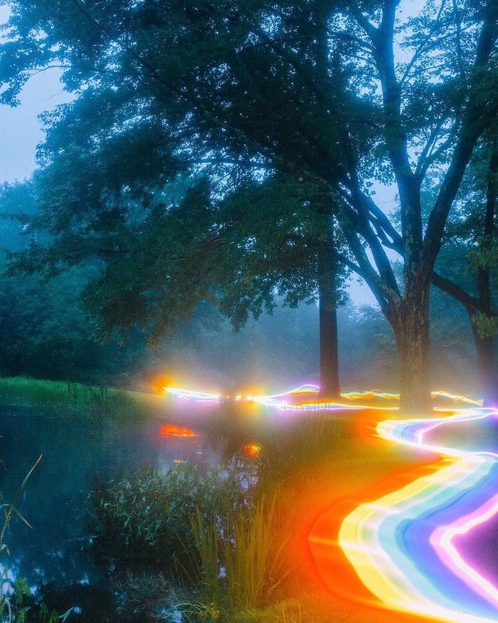Rainbow Road menjadi wadah ekspresi bagi Daniel. Selain itu, seri foto ini juga menjadi cara baginya bereksperimen dan sejenak mengasingkan diri di alam ketika gelap dan sunyi.Β Foto: Daniel Mercandante via Brainberries