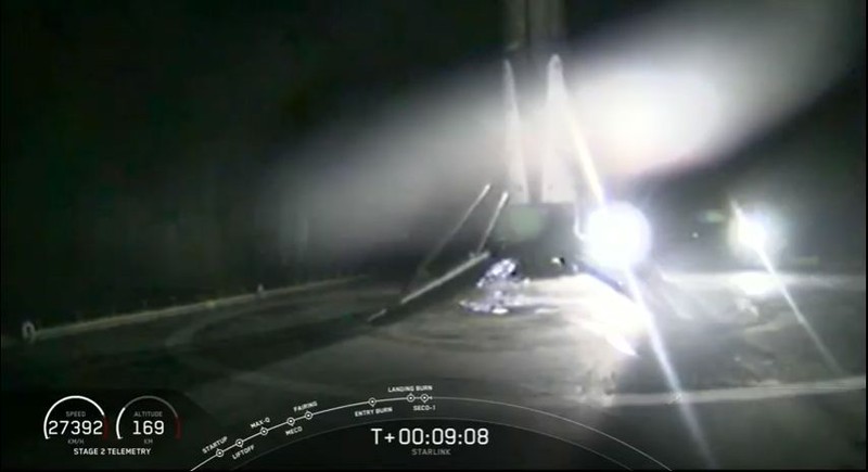 Penampakan booster yang menyalakan mesinnya untuk kembali ke Bumi. Sedangkan di sebelah kanan adalah mesin upper stage yang mendorong roket ke orbit. Foto: SpaceX