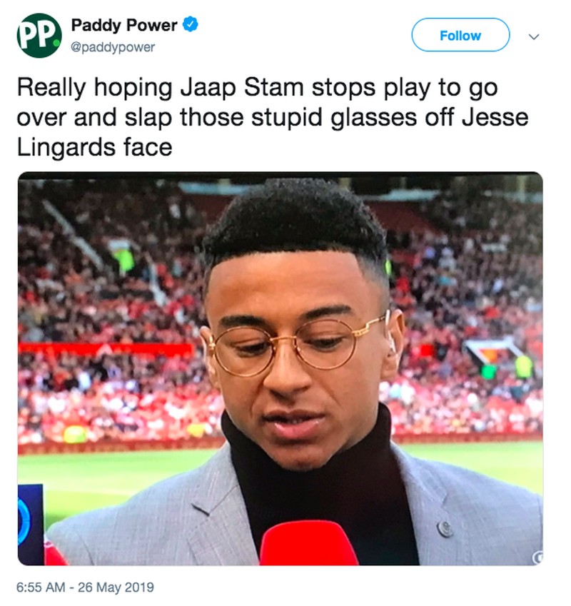 "Sangat berharap Jaap Stam berhenti bermain untuk menampar kacamata bodoh di muka Jesse Lingard," tulis akun ini yang geram Lingard kebanyakan gaya tapi minim kemampuan. Foto: Twitter