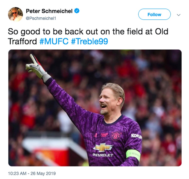 "Sangat senang kembali ke lapangan Old Trafford," tulis Peter Schmeichel. Foto: istimewa
