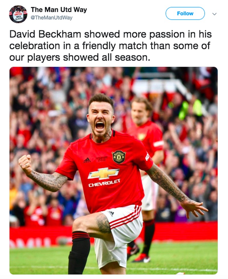 "David Beckham menunjukkan lebih banyak passion dalam selebrasinya di pertaundngan persahabatan dibanding yang ditunjukkan pemain kita," tulis akun ini. Foto: Twitter