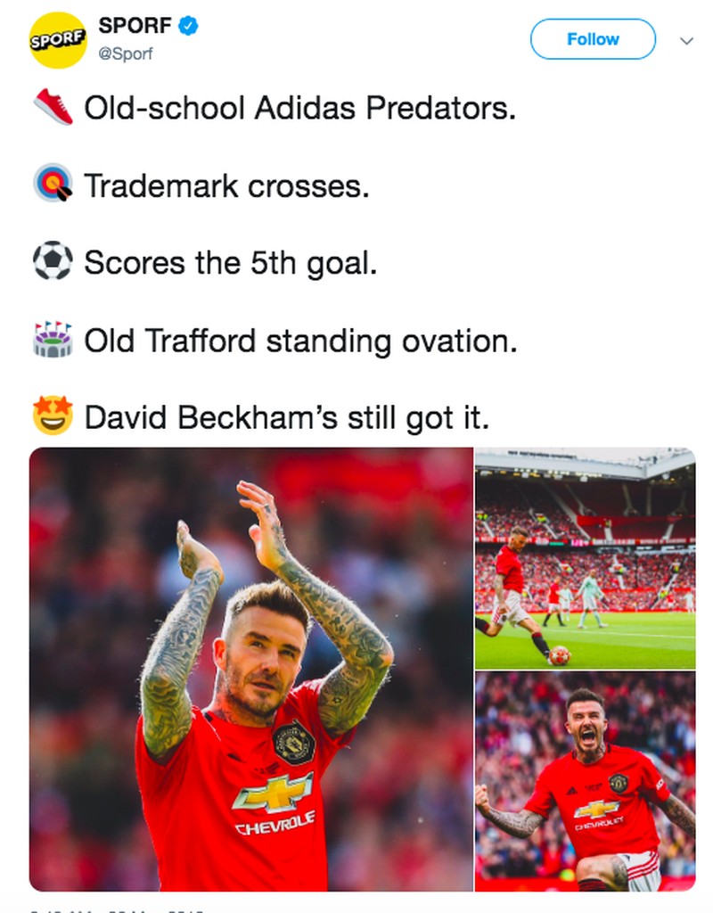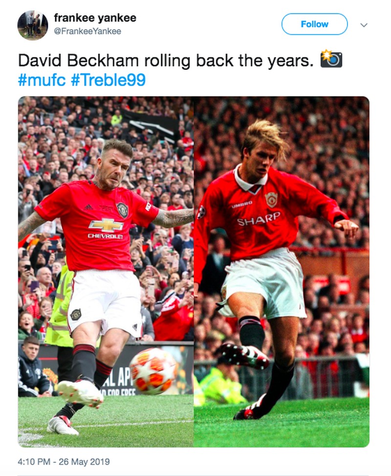 Memakai Adidas Predator, crossing ciri khasnya, mencetak gol, dan mendapat standing ovation di Old Trafford, Beckham seolah masih seperti dulu. Foto: Twitter