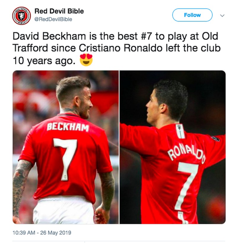 Selain Cristiano Ronaldo, Beckham dianggap pemain nomor 7 di MU yang paling gemilang sepanjang masa.Foto: Twitter