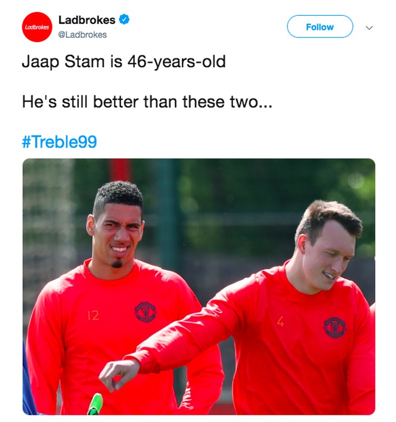 Meski sudah berusia 46 tahun, akun ini menilai Stam masih lebih baik ketimbang Phil Jones dan Chris Smailing. Foto: Twitter