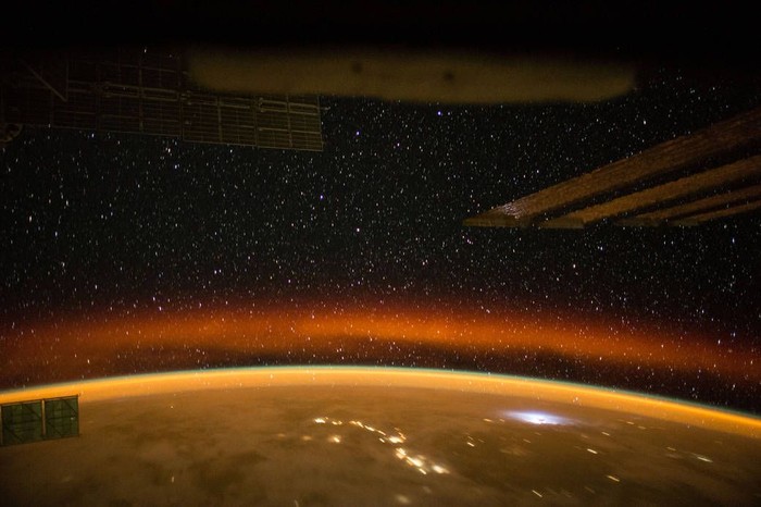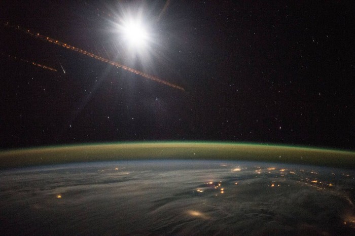 Foto long exposure dari ISS memperlihatkan Bumi diselimuti aurora di salah satu sisinya, cahaya dari perkotaan dan bintang-bintang jadi latar belakang. Foto: NASA