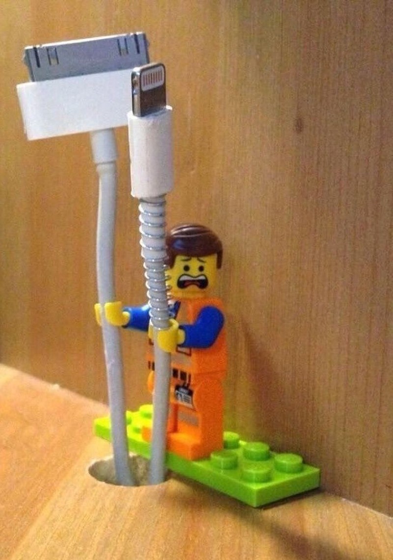 Pakai saja mainan Lego untuk menyimpan charger kabel ponsel. (Foto: Brightside)