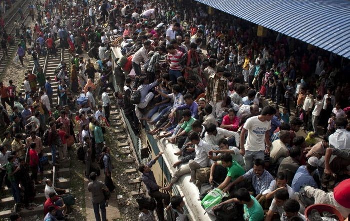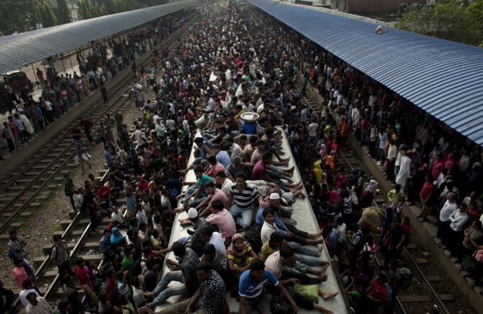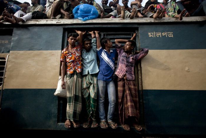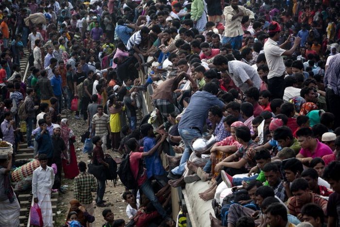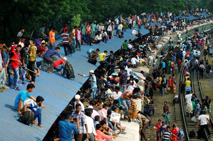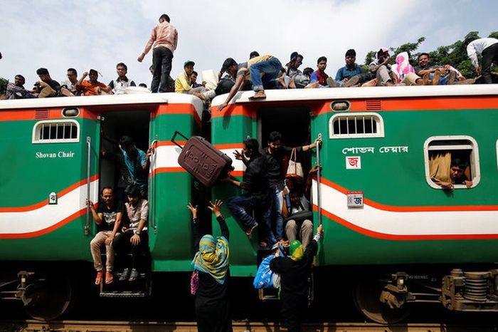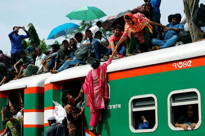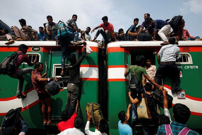 Foto-foto ini diambil pada 23 Juni 2017 di sebuah stasiun kereta api di Dhaka, Bangladesh. Sistem transportasi yang kurang baik membuat penumpang berjubel. Foto: Reuters