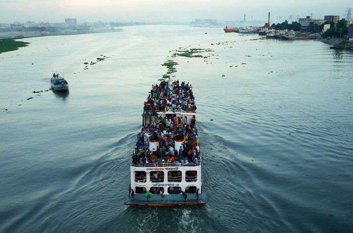 Selain memakai kereta api, warga di Dhaka juga memakai kapal feri yang sama padatnya untuk sampai ke kampung halaman. Foto: Reuters