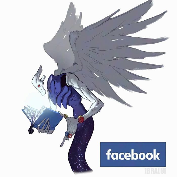 Karakter Facebook yang terlihat memiliki beragam simbol di jarinya dan sedang membaca buku rahasia. Foto: Brahim Bensehoul via Bored Panda