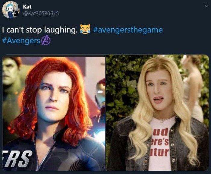 Salah satu yang paling mencolok adalah wajak dari Natasha Romanoff. Ada yang menyamakannya dengan karakter di film White Chicks. Foto: Istimewa
