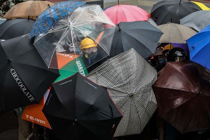 Dengan menggunakan payung mereka melindungi diri dari semprotan gas air mata yang dikeluarkan oleh polisi setempat. (Foto: Boredpanda)