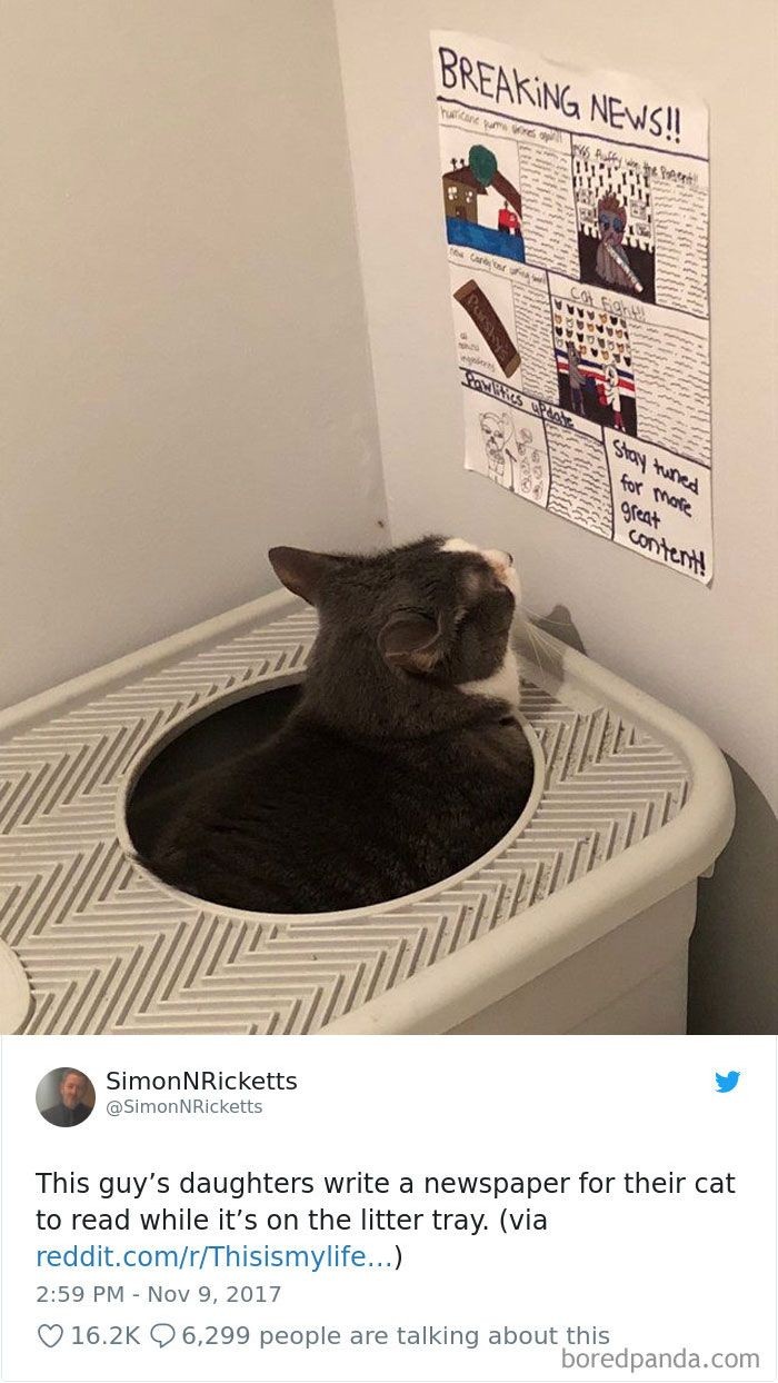 Penampakan seekor kucing yang sedang asyik membaca koran. Tingkah lucu kucing itu menarik perhatian netizen dan mencuit 'Anak perempuan orang ini menulis surat kabar untuk dibaca kucing mereka saat berada di baki sampah'. Istimewa/Dok. Borendpanda/SimonNRicketts.