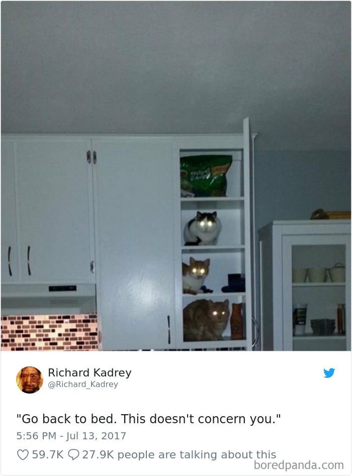 Kelakuan sekelompok kucing di malam hari yang terciduk majikannya. 'Kucing : kembali tidur, ini bukan urusanmu'. Istimewa/Dok. Boredpanda/Richard_Kadrey.