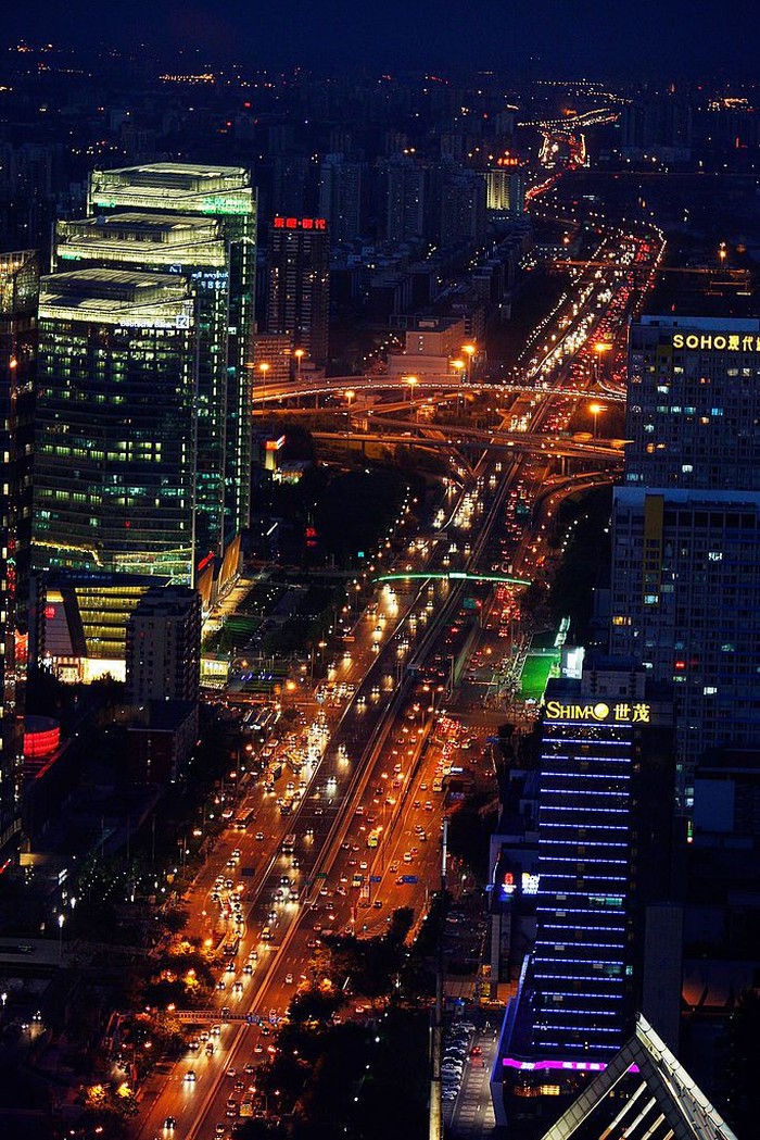 Pemandangan kota Beijing di malam hari juga tak kalah menariknya bermandikan cahaya warna-warni. Paula Bronstein/Getty Images.