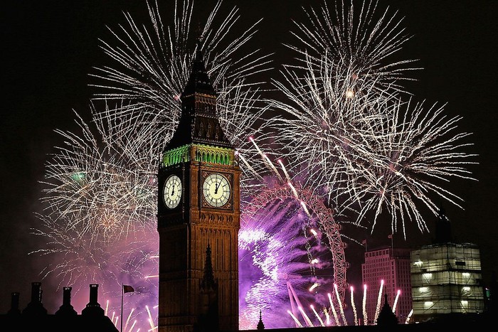 Kembang api yang menyala di langit kota London semakin membuat pemandangan ibu kota Inggris itu semakin menawan saat dijepret oleh kamera. Dan Kitwood/Getty Images.