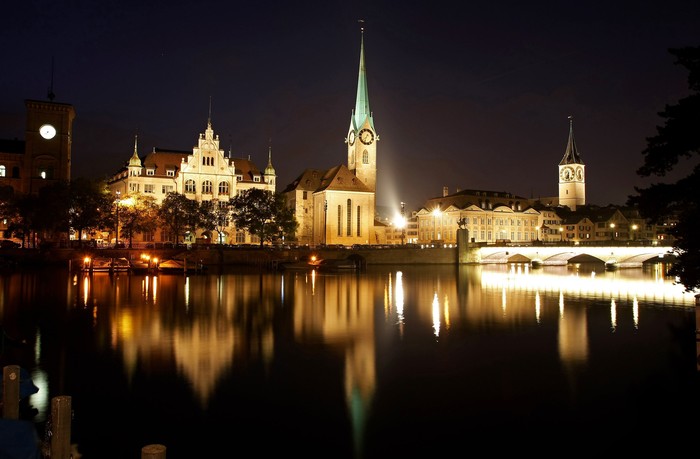Cahaya lampu yang terefleksi dari sungai di Kota Zurich, Swiss, membuat pemandangan kota itu semakin menawan di malam hari. Mike Hewitt/Getty Images.