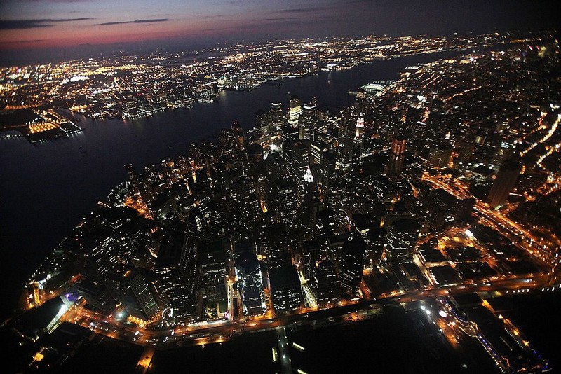 Cahaya lampu warna-warni menghiasi kota New York di malam hari. Mario Tama/Getty Images.