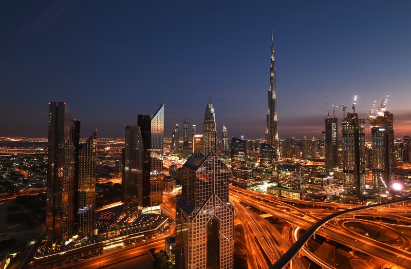 Potret keindahan kota Dubai di kala senja menuju malam. Cahaya lampu yang mulai menghiasi gedung-gedung pencakar langit membuat pemandangan kota itu semakin menawan. Tom Dulat/Getty Images.