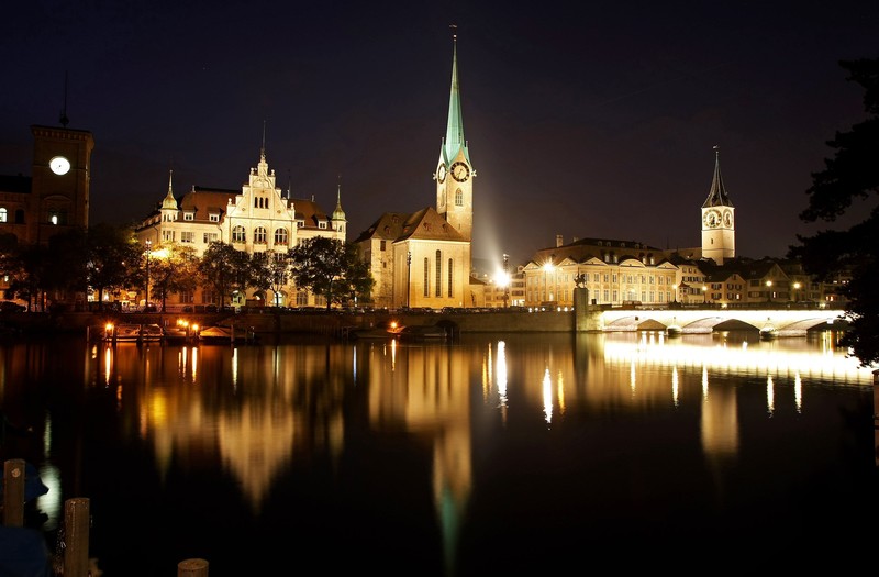 Cahaya lampu yang terefleksi dari sungai di Kota Zurich, Swiss, membuat pemandangan kota itu semakin menawan di malam hari. Mike Hewitt/Getty Images.