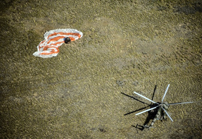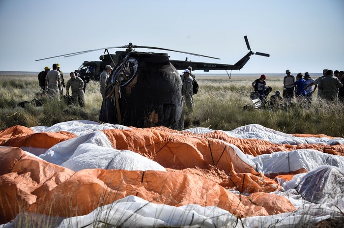 Kapsul itu memakai parasut untuk memperlambat lajunya menuju ke permukaan Bumi. Ia mendarat di daerah terpencil di Dzhezkazgan (Zhezkazgan), Kazakhstan, pada 25 Juni waktu setempat. Foto: Reuters