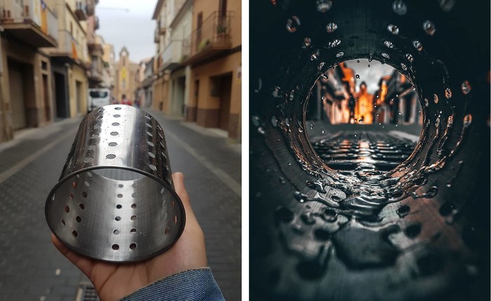 Konsep yang sama namun menggunakan benda berbeda. Ketika menggunakan semacam wadah peniris alat makan ini, namun tanpa penampang, efek yang dihasilkan tampak lebih dramatis. Foto: Instagram/jordi.koalitic