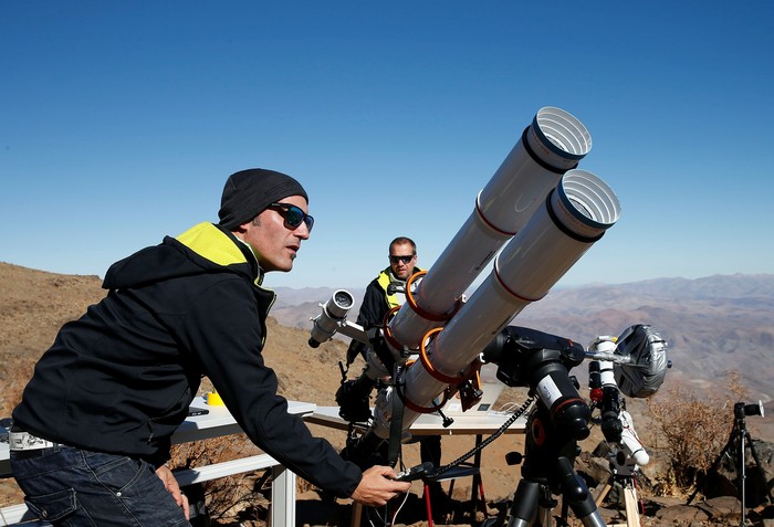 Beberapa warga menyiapkan teleskop di lokasi yang dianggap paling baik. Foto: Reuters