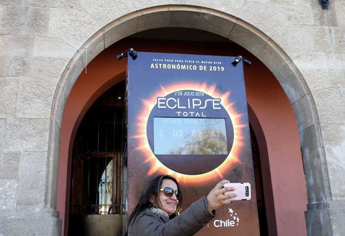 Di Chile, spanduk soal gerhana Matahari total sepeti ini sudah bertebaran. Foto: Reuters