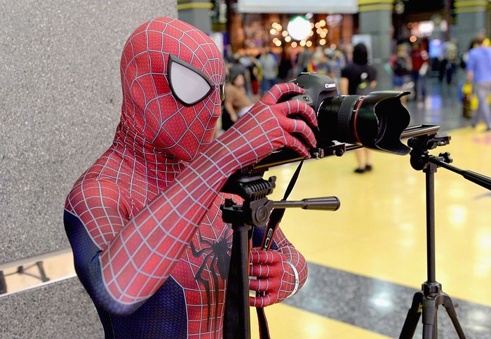 Seperti Peter Parker yang seorang fotografer, aksi cosplayer Spider-Man ini pun demikian. (Foto: Daniel Boczarski/Getty Images for Wizard World)