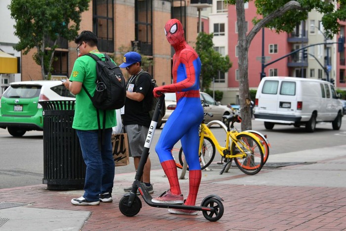 Spider-Man ini bukan kehabisan jaring laba-laba melainkan cuma gaya dari cosplayer di Comic Con 2018. (Foto: Dia Dipasupil/Getty Images)