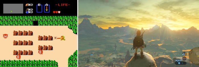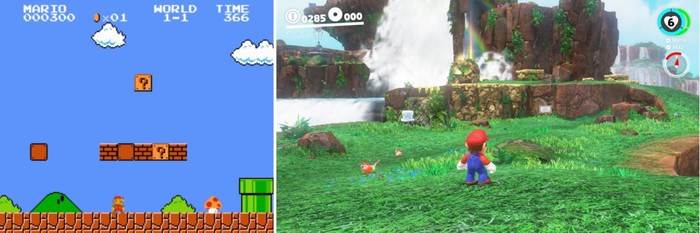 Gamer jadul pasti familiar banget dengan penampakan game Mario di kiri. Sekarang, Mario sudah bertransformasi tanpa semata side scrollling. (Foto: via Reddit)