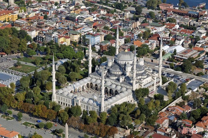 Potret Masjid Sultan Ahmed di Istanbul, Turki, yang dipotret dari udara. Masjid ini punya julukan sebagai Masjid Biru. Tamergunal/Getty Images.