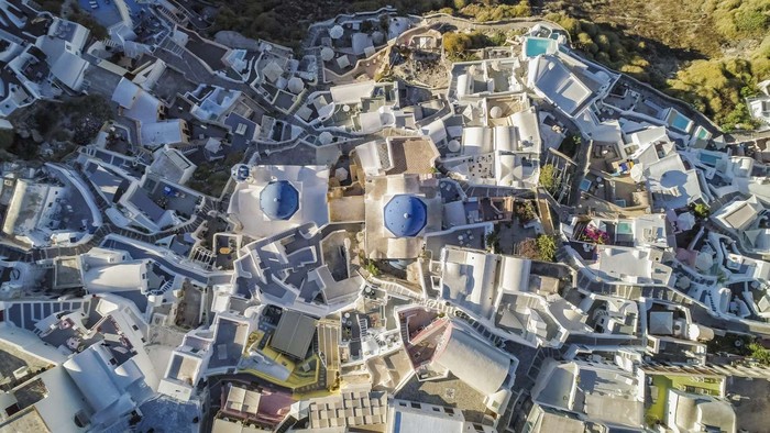 Desa kecil yang terletak di pulau Thira, Yunani ini bernama Desa Oia. Desa ini merupakan bagian dari Santorini. marchello74/Getty Images.
