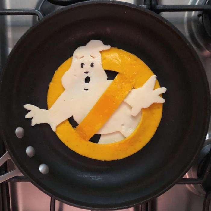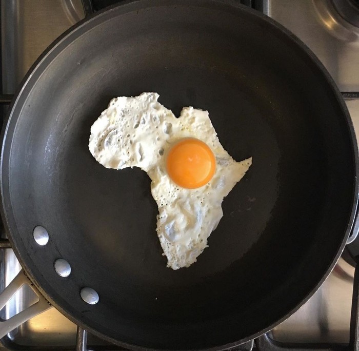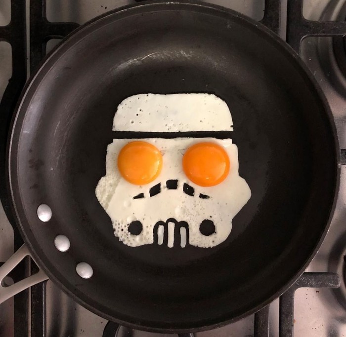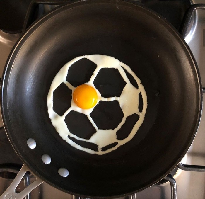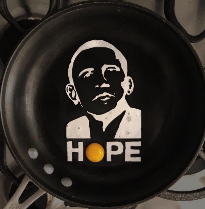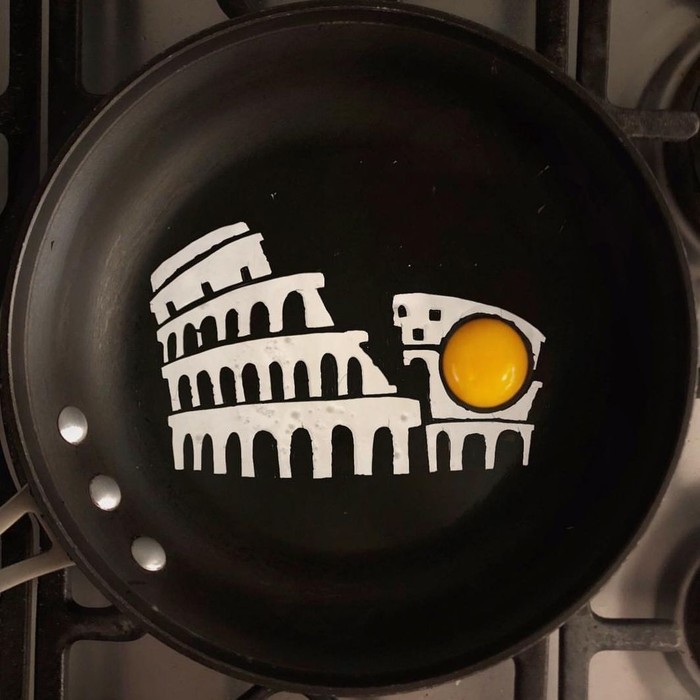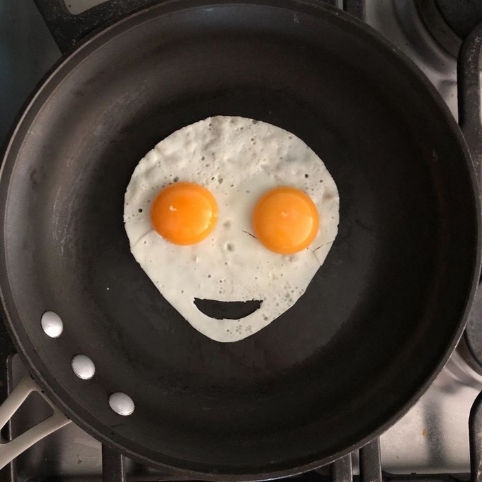 Di atas teflon, ia pecahkan telur yang kemudian ia ciptakan menjadi karya gambar. Foto: Instagram/the-eggshibit