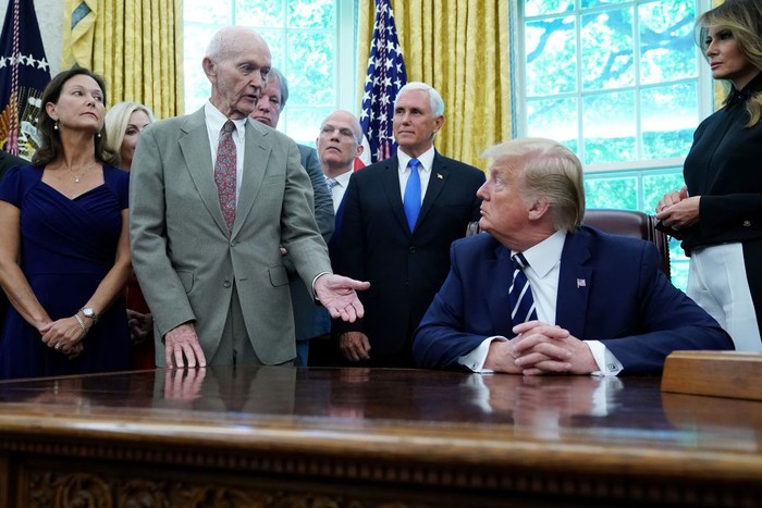 Presiden AS, Donald Trump, menerima Buzz Aldrin dan Michael Collins di Gedung Putih. Foto: Getty Images