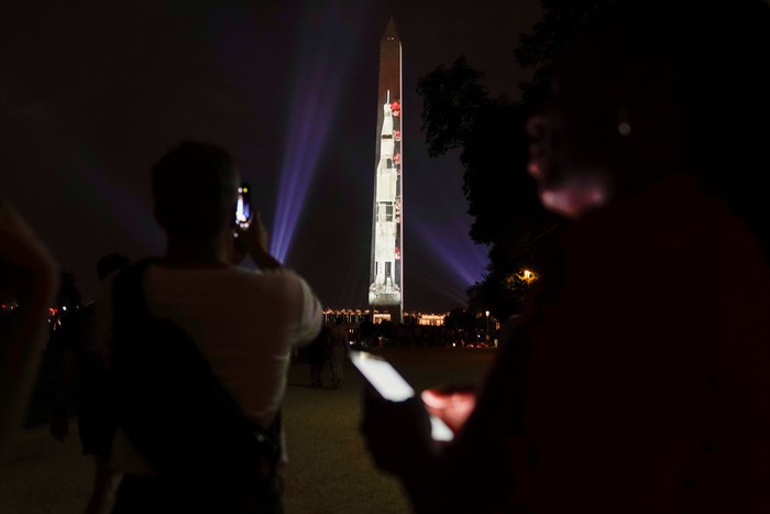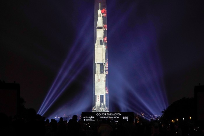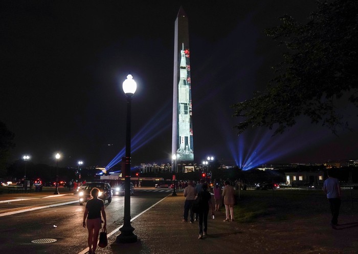 Monumen Washington memancarkan gambar roket Saturn V yang meluncurkan Apollo 11 ke Bulan. Foto: Reuters