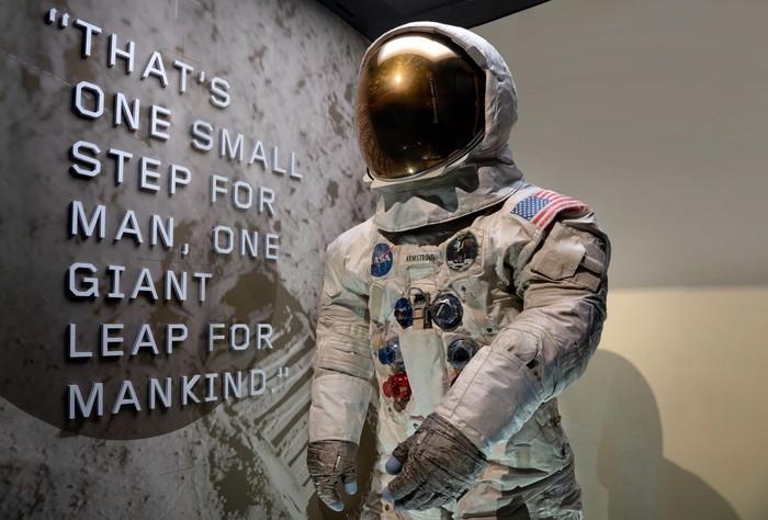 Baju angkasa Neil Armstrong lengkap dengan quotenya yang terkenal di latar belakang. Foto: Reuters