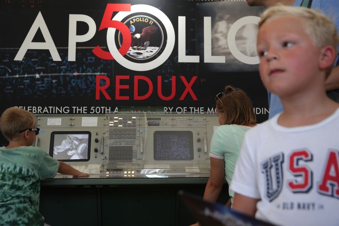 Anak-anak dengan antusias mengamati ruang replika saat misi Apollo 11. Foto: Getty Images