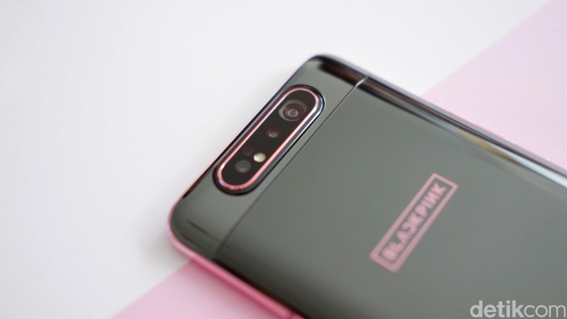 Galaxy A80 mengusung kamera yang unik. Jadi ketika ponsel ini hendak digunakan untuk selfie, akan ada bagian yang terangkat. Lalu kamera yang tadinya menghadap ke belakang bakal berputar otomatis ke depan. Foto: Adi Fida Rahman/detikINET