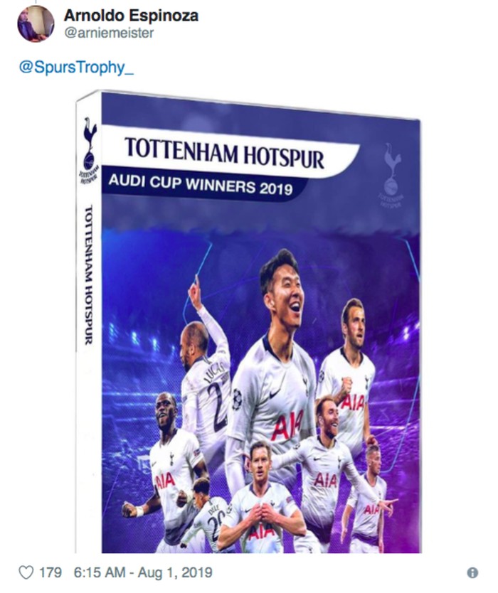 "Senang Spurs membangun mental juara mereka di Audi Cup. Dan juga melihat Moura menang trofi pertamanya," Foto: Twitter
