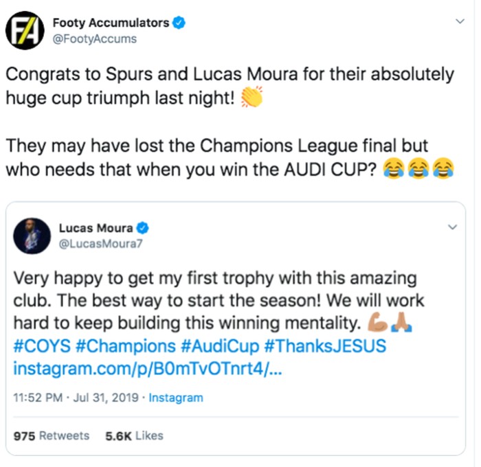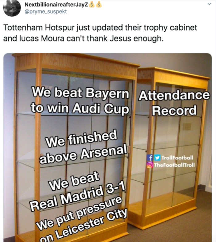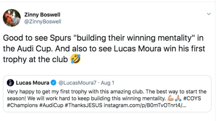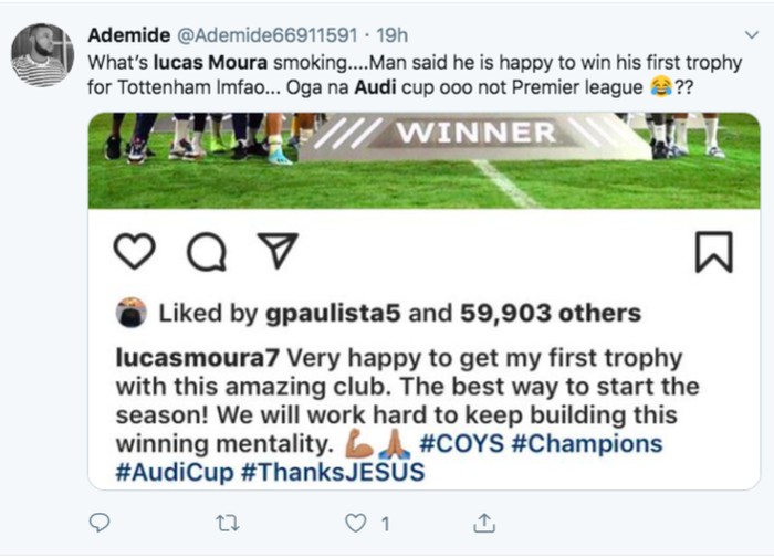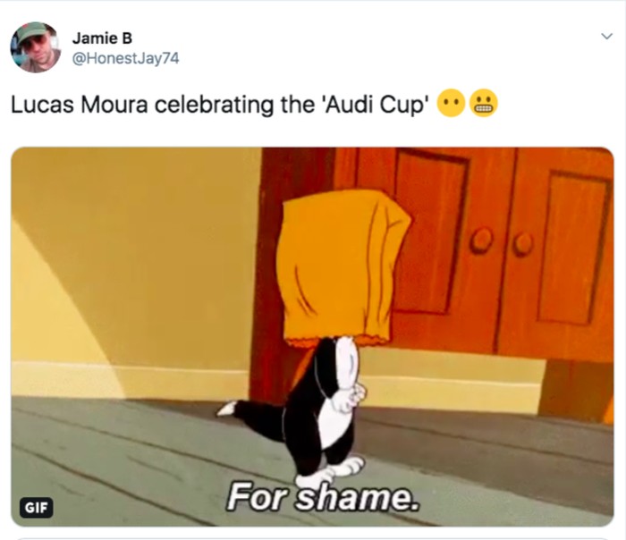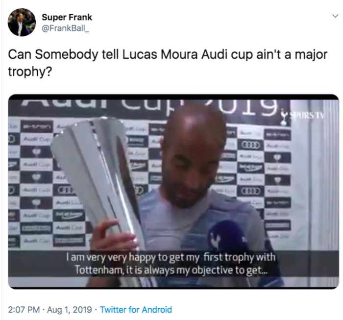 "Selamat buat Spurs dan Lucas Moura untuk kemanangan piala mereka yang luar biasa. Mungkin mereka kalah di final Liga Champion tapi siapa yang butuh itu jika kalian bisa menang Audi Cup?" sindir netizen ini. Foto: Twitter