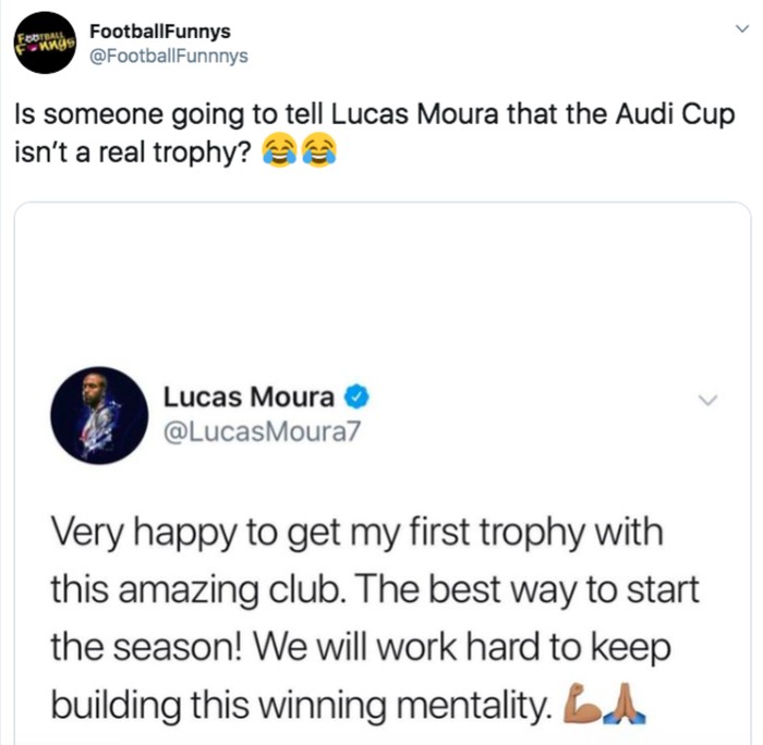 Inilah pernyataan penuh kebanggaan Moura bahwa dia sangat senang meraih trofi pertamanya dan akan bekerja keras membangun mental juara. "Apa ada seseorang yang akan memberitahu Moura bahwa Audi Cup bukan piala yang nyata?" tanya netizen ini. Foto: Twitter