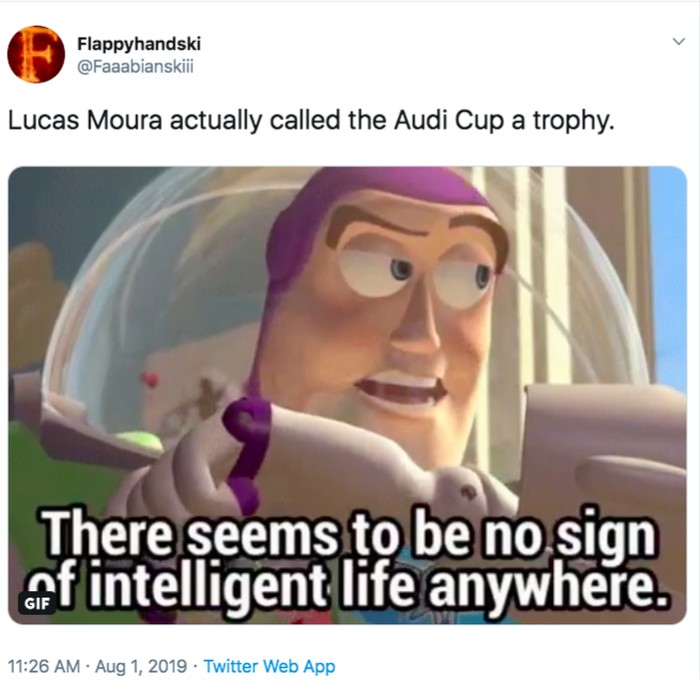 Netizen ini menyindir melalui karakter Buzz Lightyear bahwa Moura tidak pintar karena menyebut Audi Cup adalah piala sungguhan. Foto: Twitter
