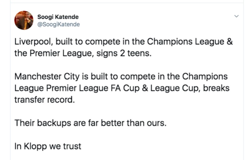 "Liverpool yang berkompetisi di Liga CHampions dan Liga Inggris menggaet dua remaja. Manchester City memecahkan rekor transfer," sebut netizen ini yang merasa cemas Liverpool akan tertinggal dari City musim ini. Foto: istimewa