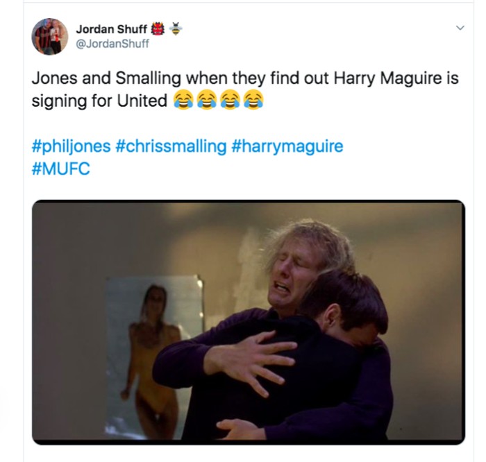 Jones dan Smalling berpelukan sambil menangis mendengar kedatangan Maguire. Foto: istimewa