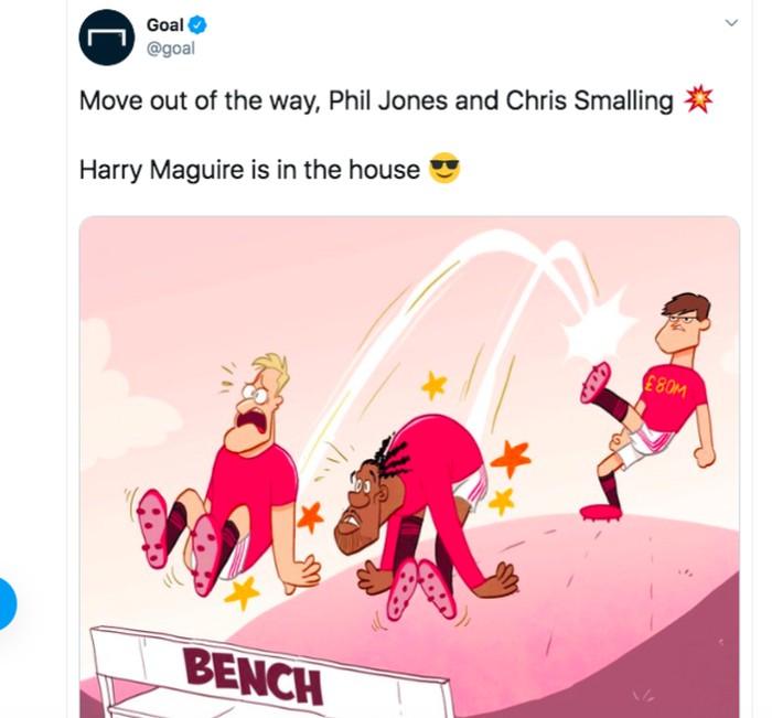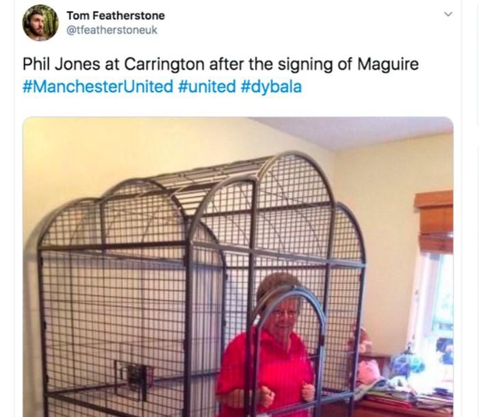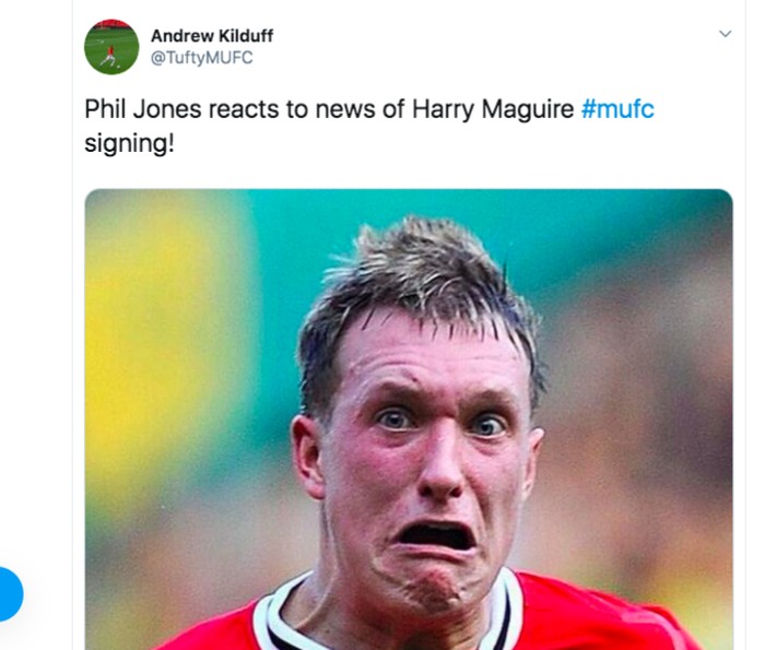 Ekspresi Phil Jones ketika mendengar MU resmi merekrut Harry Maguire. Foto: istimewa
