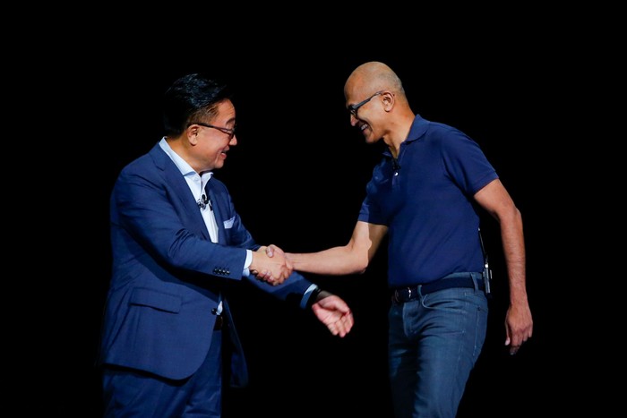 Nadella mengumumkan kerja sama Microsoft dan Samsung yang menghasilkan aplikasi mobile Android yang akan bantu menjembatani perangkat tersebut dengan PC yang menggunakan sistem operasi Windows.Β Foto: Reuters