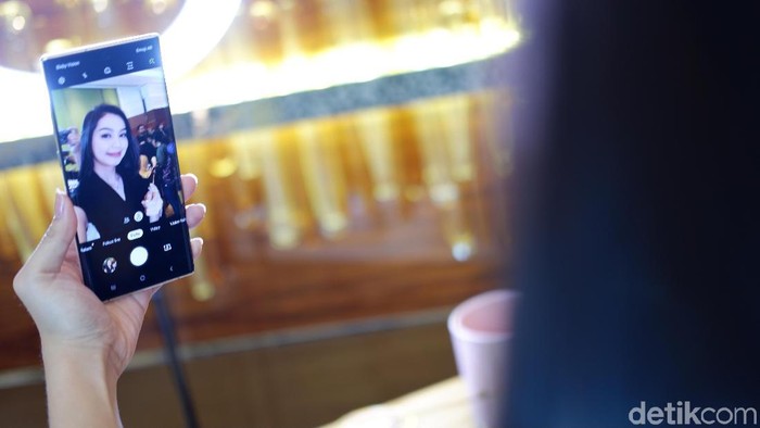 Tampak depan Galaxy Note 10 maupun Galaxy Note 10+ secara fisik juga serupa di bagian infinity O Display yang menjadi tempat bernaungnya kamera selfie 10MP. Foto: Adi Fida Rahman/detikINET