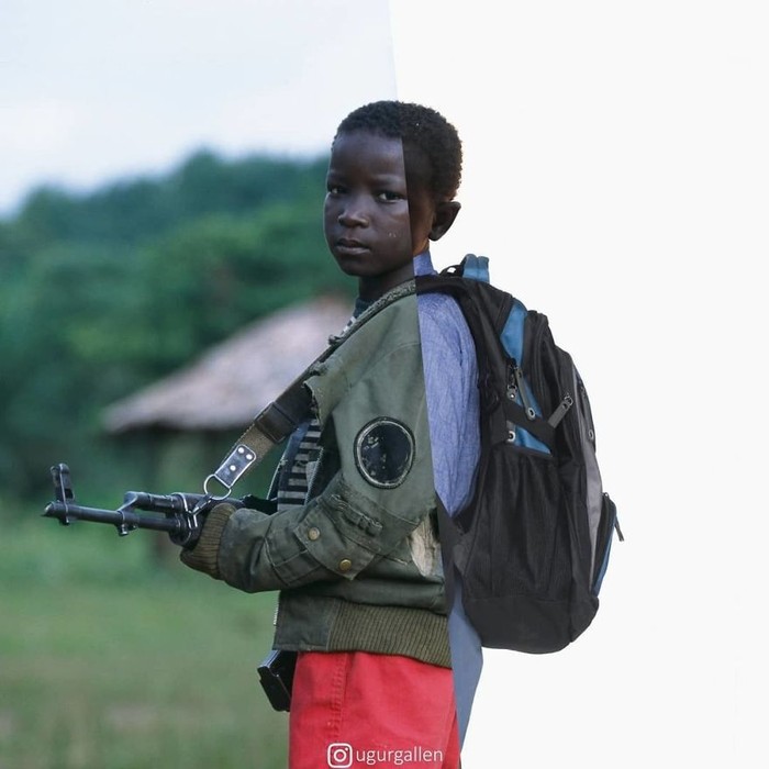 Pejuang anak dengan pose dengan pistol di fasilitas pelatihan militer selama perang saudara Liberia. Foto: Uğur Gallenkuş