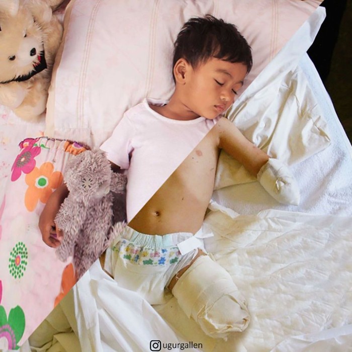 Ali Nassar Fadil, 4 tahun, terbaring di sebuah bangsal di rumah sakit Palang Merah Italia, pada 13 April 2004 setelah kehilangan lengan dan kaki kirinya setelah ledakan dari udara oleh pasukan AS yang menewaskan kakeknya dan 9 lainnya di Fallujah, Irak. Foto: Uğur Gallenkuş